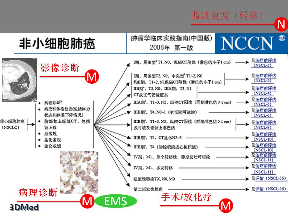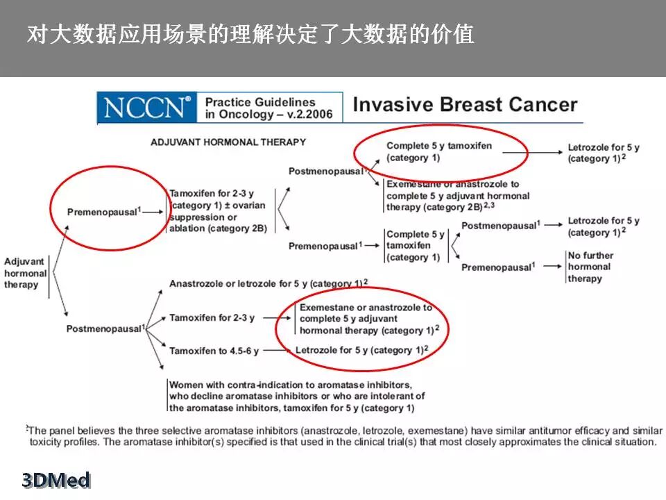 只要记住这几张幻灯片,所有的肿瘤相关的市场会看非常的清楚。本质上你要了解医生是如何治疗肿瘤的,不是行为很简单,是逻辑很简单。这是一个NCCN的指南,医生凭着这个指南来做,他应该做哪一个检测,不同的病理检测,对应的临床治疗策略是什么,医生是按照这个指南进行治疗,这里是Must Have。因为这些指南都是依据各种病理检测的分类进行临床试验,通过循证医学得来的。这里所有的决策判断看上去都是非常标准的,但这里的判断标准非常的复杂。医生还要考虑患者不同体质,不同的副作用承受能力等等。
