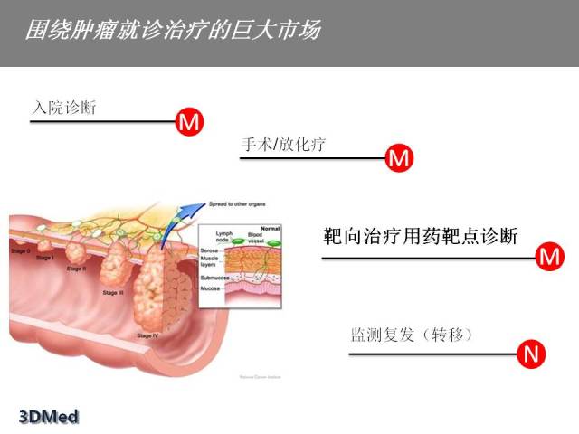 如果要了解肿瘤基因组大数据的前景,我们首先要了解一个肿瘤病人入院之后要展开哪些消费行为,哪些是属于Must Have,哪些是Nice To Have。先做基本的检测,做B超,做PET-CT等等,甚至要做核磁,还要做手术和放化疗,有些会使用靶向药物。这些都属于MustHave。很多投资人询问我关于预测复发转移的技术的市场前景,复发转移是属于Nice to Have项目。这是个非常复杂的话题,复发转移在临床上非常的重要,但预测复发转移的技术非常难,目前普遍没有好的办法,所以当下阶段还是属于Nice To Have的市场。
