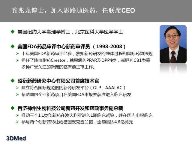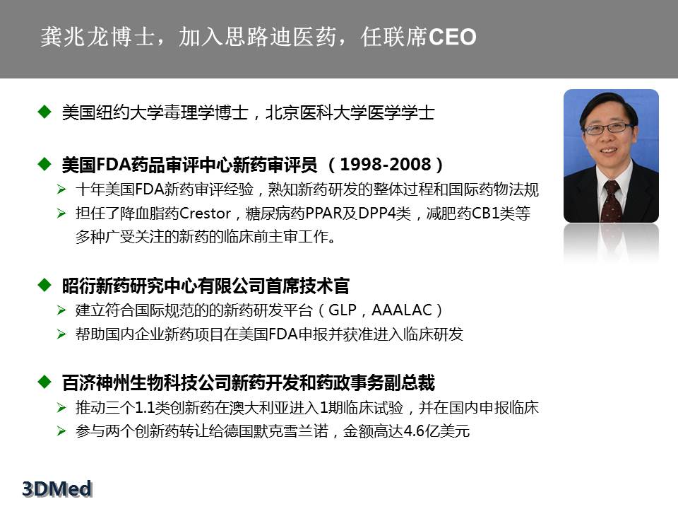 接下来介绍我们的新任联席CEO,龚兆龙博士。龚兆龙博士是FDA资深的新药审评专家,也是百济神州的前临床药物开发VP。龚兆龙博士加入思路迪医药,也代表了新药审评和药物开发资深专家对肿瘤基因组大数据在个性化新药开发中的价值所在的高度认可,龚兆龙博士将和3DMed的同仁们一起开创来自未来的肿瘤医疗商业模式。