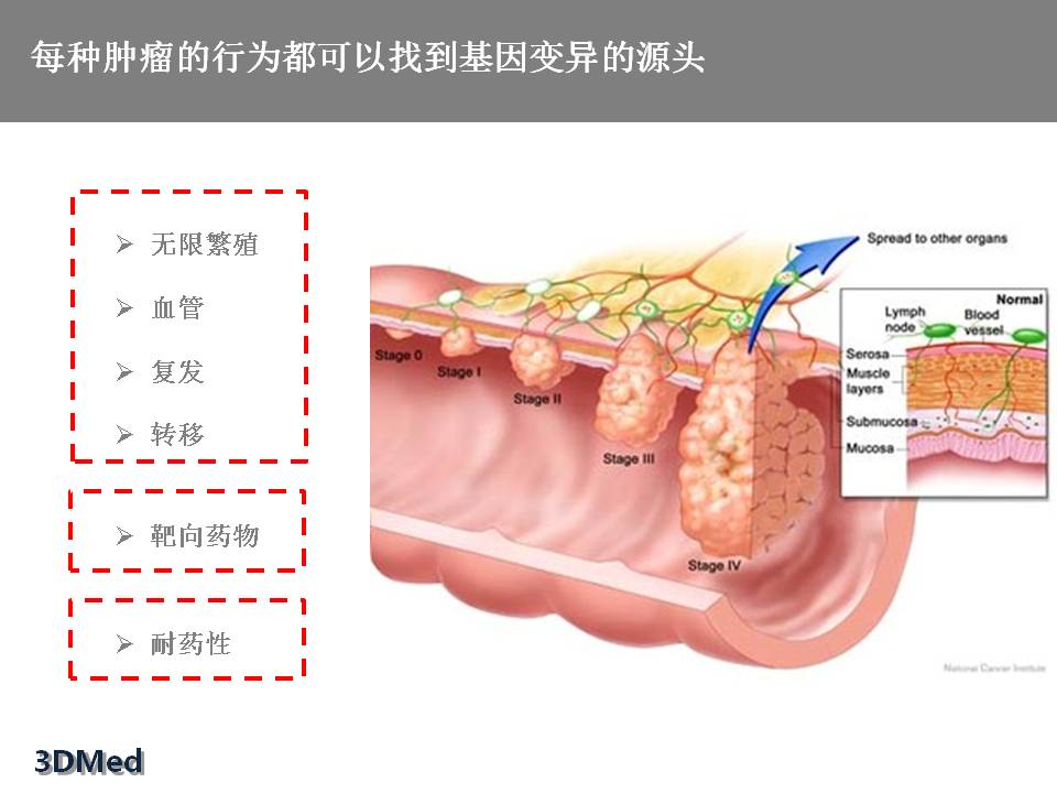 第三:每个肿瘤的行为都可以找到对应的基因变异,大家都知道的特征,一个肿瘤从一期、二期、三期、四期到这么大,都有对应的基因变异去控制驱动这些过程。比如肿瘤细胞的无限增殖能力,比如肿瘤组织中生长出一个血管,为其中心不断的供氧。通过外科手术把肿瘤切除掉,多数情况下还会复发,因为所切除的是肉眼可见的。为了防止切除不干净,甚至还要在远端切除更多,但这还不能保证周围是否有更小的肿瘤,肉眼不可见的,但已经有几千万的细胞。因为肉眼可见已经是几亿甚至几十亿个细胞了。此外,在切除的过程中,是否会形成种植转移?不幸的是,这是经常发生的。肿瘤还可以穿过皮层进入血道转移。如果形成转移,就基本无法根治了。所有这些行为都和基因变异有关系。这些行为都受到基因的调控。因此,我们可以专门针对这个行为,设计药物,比如破坏血管,抑制复发,杀死肿瘤细胞等等。但就像使用抗生素杀死细菌一样,最终肿瘤细胞会产生新的基因变异从而形成耐药性。所有这些包括耐药性都可以在基因变异上都可以找到源头。