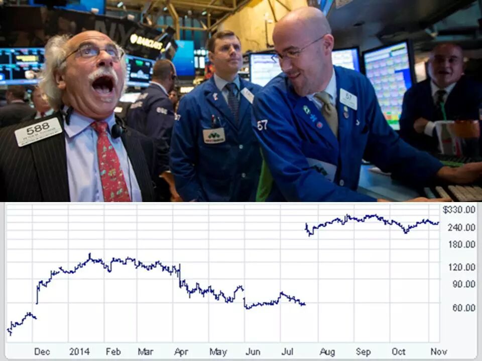 这是美国一家叫PUMA的公司,因为公布了一项积极的临床试验结果,一夜之间股价翻了三倍,这是华尔街交易人的表情,看到股价开盘的时候,涨了289%,不公布临床试验结果之前,绝大部分的人是看不懂里面数据的。