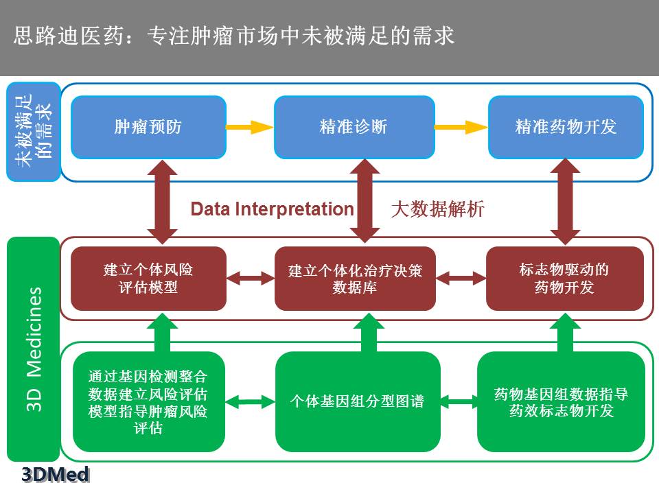 最后简单介绍一下我们公司。我们3DMed(思路迪)运用肿瘤基因组大数据,建立风险评估模型,进行个体化的肿瘤预防、精准用药指导和个性化新药开发。肿瘤预防、用药和新药开发中的高风险管理都需要依靠数据支持每一个决策,基因组大数据是决策中心。