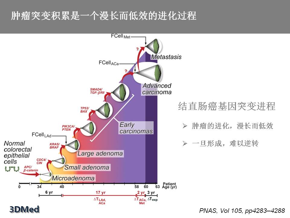 第二:在座的人身上,有很大概率,80%到90%都携带有肿瘤。一个肿瘤的发生,需要20到30年时间。起初这种突变很少,在人生的漫长过程中,不断地积累这些突变,所以肿瘤是非常漫长而且低效的过程,因为花了30年的时间,才能积累到影像上可见的一公分或者两公分,这时已经有几亿甚至几十亿的细胞了。当有几百万的细胞的时候,目前任何影像手段都无法检测。其实在这个阶段,已经有上百万个肿瘤细胞。解剖结果表明,有近20%的人脑部发现有肿瘤,说明人体长期携带肿瘤是很常见的情况。