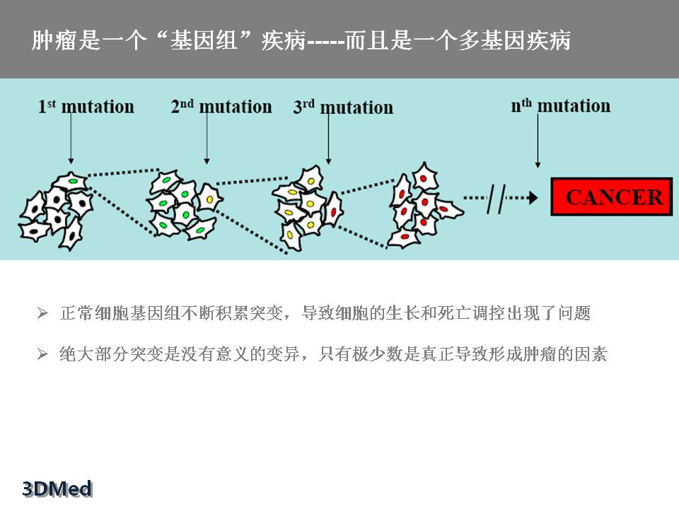 第一:肿瘤的基因组,从一个突变到不断地积累,有成百上千,甚至上万个基因变异。但绝大部分的突变是没有任何意义的,只有极少数有功能。在突变过程中伴随着很多改变细胞功能的突变,但就像人类进化,不是身体上拥有的特征最终都是有用的。