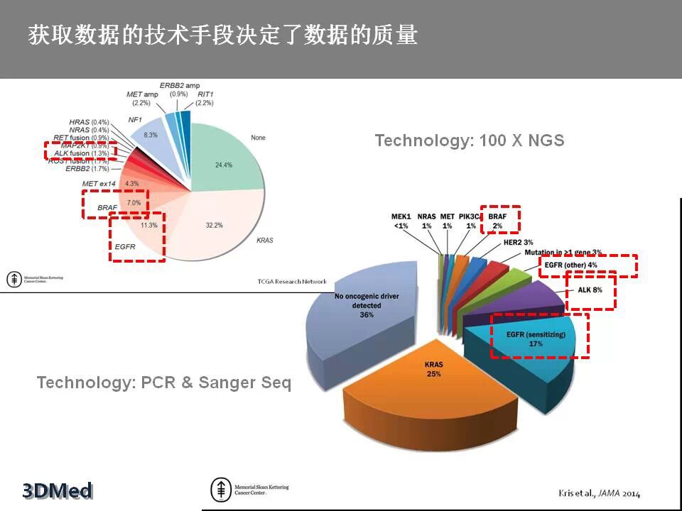 左边这个是美国的TCGA数据,美国累计花了十几亿美元测了几万个样本。右边是美国权威杂志JAMA最新的一项研究数据,同样两组非常权威的研究测EGFR突变,这个系列的药全球销售十几亿美元,左边数据显示肺癌变异率是11%,右边数据是21%,你们相信谁的数据?另外,如果你们了解辉瑞公司这个药的话,就知道ALK这个基因8%的变异是靠谱的,左边数据库1%的变异是错误的。但我接下来会告诉你,8%这个其实也是不对的,你会怎么想?不要认为辉瑞这样的大制药公司就掌握了正确的基因组数据,我后面会提到他的误判。所以,你要对肿瘤基因组测序技术和数据分析非常了解,因为有的时候用这个技术,有的时候用那个技术,有的时候两个技术都是错的,测序技术五花八门,没有绝对好的技术,数据分析更为复杂,需要Case By Case的分析和使用技术。