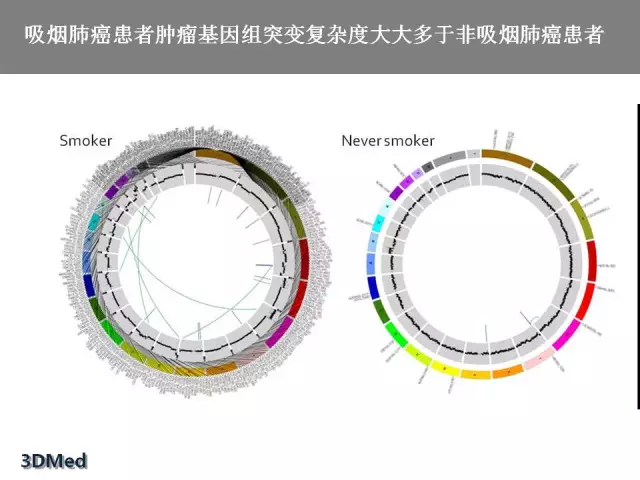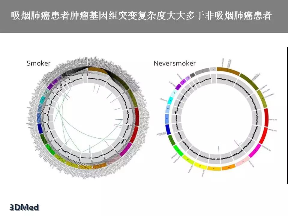 这张图显示,肿瘤基因组测序的结果显示,吸烟和不吸烟的肺癌患者对比,吸烟的病人的肿瘤突变率更高,复发会更快,因此可以通过基因组测序就知道有各种各样的基因变异,这可以解释为什么恶劣的环境会加速肿瘤的发生。因为恶劣的环境会增加突变的频率。也就是说,虽然有没有恶性的环境,肿瘤会照样发生,比如西方的肿瘤发生率和中国类似,但没有中国人肿瘤的恶性程度高,发病年龄也晚,因为他们的环境很好。